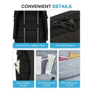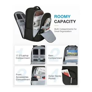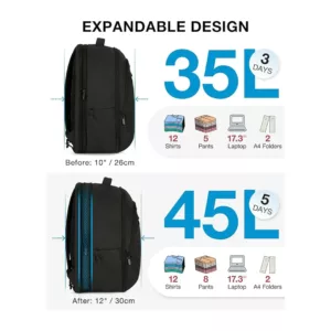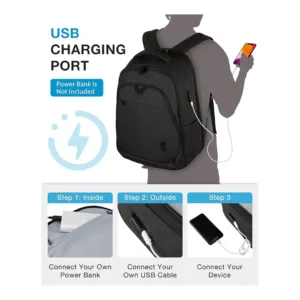 MUlTI-COMPARTMENTS- 3 main compartments & 12 allocated inner pockets & 2 side pockets, holds up to 17.3 inch computer, providing a dedicated space for your tablet, chargers, mouse, pens, textbooks, A4 folders, keys, wallet, clothes, shoes, sunglasses, bottle and more. Laptop backpack allows you to put your daily necessities & tech electronics accessories in an organized manner. UNIQUE DESIGN- Expansion system of main compartment makes the back pack easy to expand from 28L to 35L. Besides, RFID-blocking pocket, PVC pocket, hidden back pocket and convenient luggage strap ensure a easy trip. Breathable sponge mesh ergonomic design of the back and shoulder straps offers lightweight carrying and relieves shoulder stress, providing a long time and easy way to carry on. USB CHARGING PORT- Built-in USB PORT offers bookbags a more easier way to charge your phone by the connected power bank while walking or cycling. (POWER BANK IS NOT INCLUDED). LONG LASTING- Made of water resistant and durable polyester fabric, metal double-way zippers make opening/closing simple and fast. It’s perfect for professional office work, business travel, weekend getaway life. The unisex backpack can fit men and women. THIS ITEM IS NOT INTENDED FOR USE BY CHILDREN 12 AND UNDER.