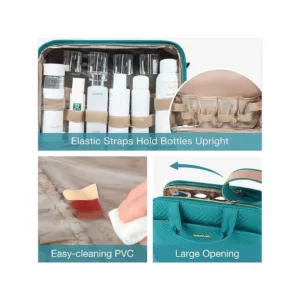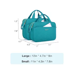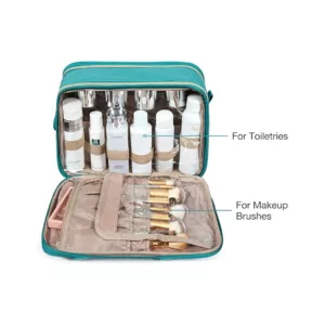 Special Design- Double side full open design keeps cosmetic bottles can stand upright in the middle compartment. Both sides pockets are design for makeup brushes, eyeshadow palette and other cosmetics. Easy to Access- Features dual zippered, large opening, making it quickly reach into the main compartment.Simply pull on the connected zip puller for full exposure. Large Capacity: Large: 12 x 4.7 x 9 inches, Small: 11 x 4.3 x 7.8 inches. 5 compartments meet all your storage needs. 1 main large capacity compartment can keep all your travel essentials organized. 2 side PVC pocket for makeup brushes or other tools. 1 dry and wet separated pocket for wet towel and toothbrush. 1 front zipper pocket for towels, hand cream, keys, wallets, etc. Suitable for your business trip or weekend holiday.