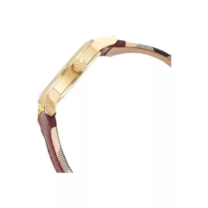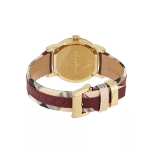 Red leather starp and gold case . Rose check stamped dial with rose gold-tone index hour markers. Minute markers around the outer rim. Dial Type: Analog. Date display at the 3 o’clock position. Quartz movement. Scratch resistant sapphire crystal. Pull / push crown. Solid case back. Case diameter: 34 mm. Round case shape. Band width: 20 mm. Deployment buckle. Water resistant at 50 meters / 165 feet. Functions: date, hour, minute, second. Casual watch style. Burberry The City Rose Dial and Red strap Ladies Watch BU9111.