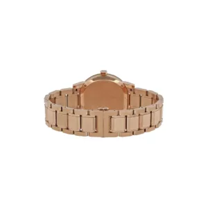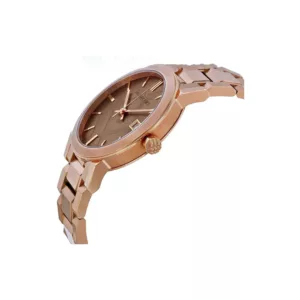 Rose gold-tone stainless steel case and bracelet. Fixed rose gold-tone bezel. Rose check stamped dial with rose gold-tone hands and index hour markers. Minute markers around the outer rim. Dial Type: Analog. Date display at the 3 o’clock position. Quartz movement. Scratch resistant sapphire crystal. Pull / push crown. Solid case back. Case diameter: 38 mm. Round case shape. Deployment clasp. Water resistant at 50 meters / 165 feet. Functions: date, hour, minute, second. Casual watch style. Burberry Rose Dial Rose Gold-tone Ladies Watch BU9034.