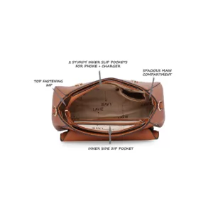 Beech satchel has a top zip closure for safety and security. The interior has a main spacious compartment with 2 slip pockets, 1 inner zip pocket and 1 external zip pocket, providing plenty of storage space for keeping phone, portable charger, keys, hairbrush, wallet, sunglasses, sanitizer etc. It also has a detachable and adjustable sling belt for multipurpose use.