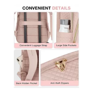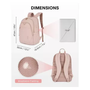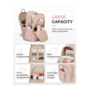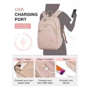 Multi Compartments Total 4 compartments 1 separate laptop compartment, 1 main compartment and 2 front compartments provide super large capacity for your computer, A4 folder, books, clothes. USB Charger Port With inside charging cable and outside USB port, the backpack offers an easy way to charge your devices. No need to keep power bank on the hand, just keep up your phone and on the go. THIS ITEM IS NOT INTENDED FOR USE BY CHILDREN 12 AND UNDER.